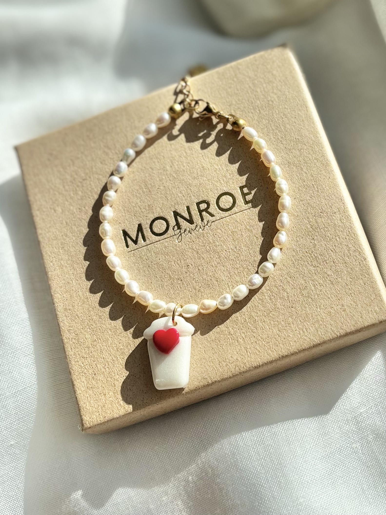 Le bracelet LOVE COFFEE en perles d’eau douce naturelles de couleur crème (forme grain de riz) est composé d’un pendentif en forme de mug fait à la main en pâte polymère.